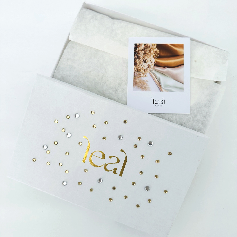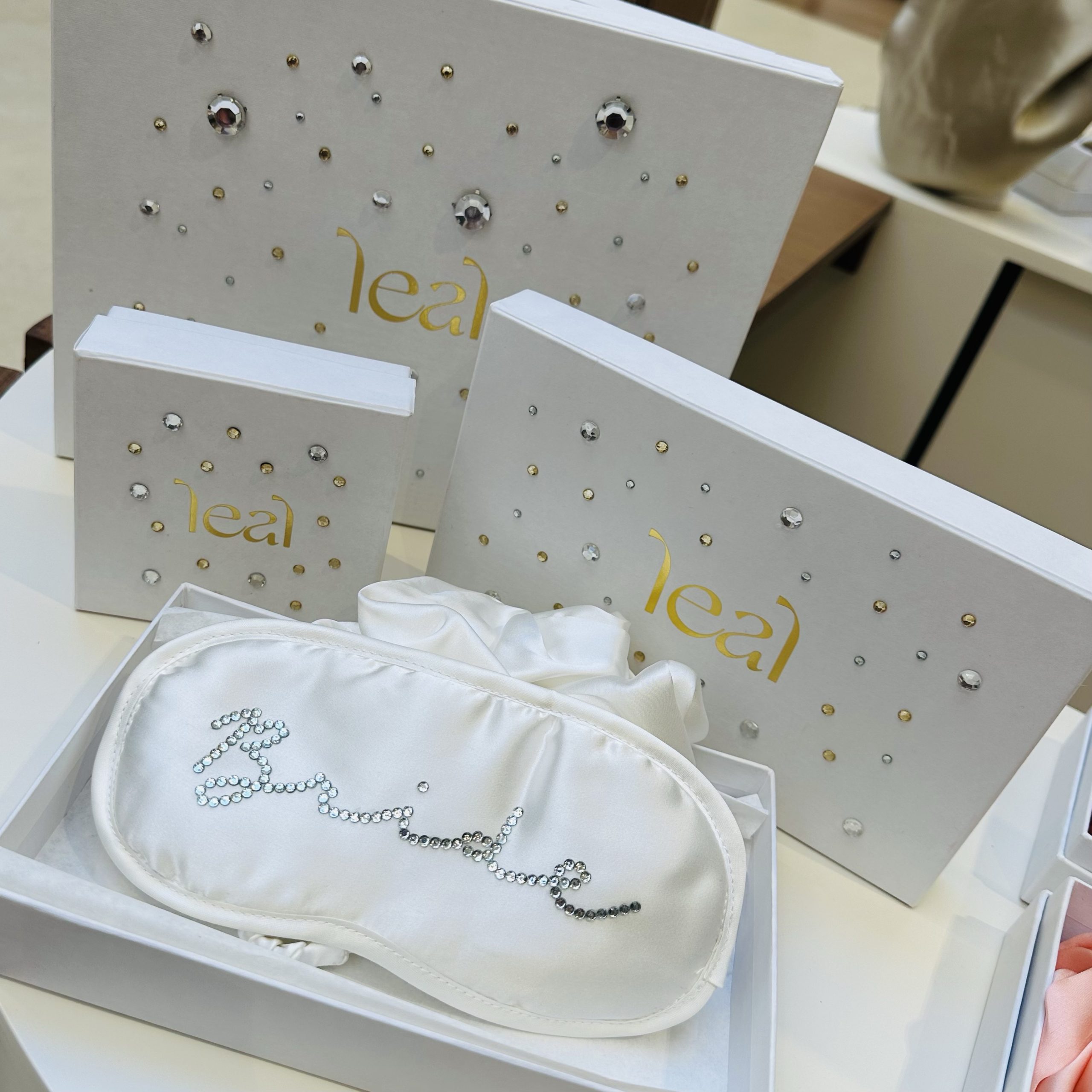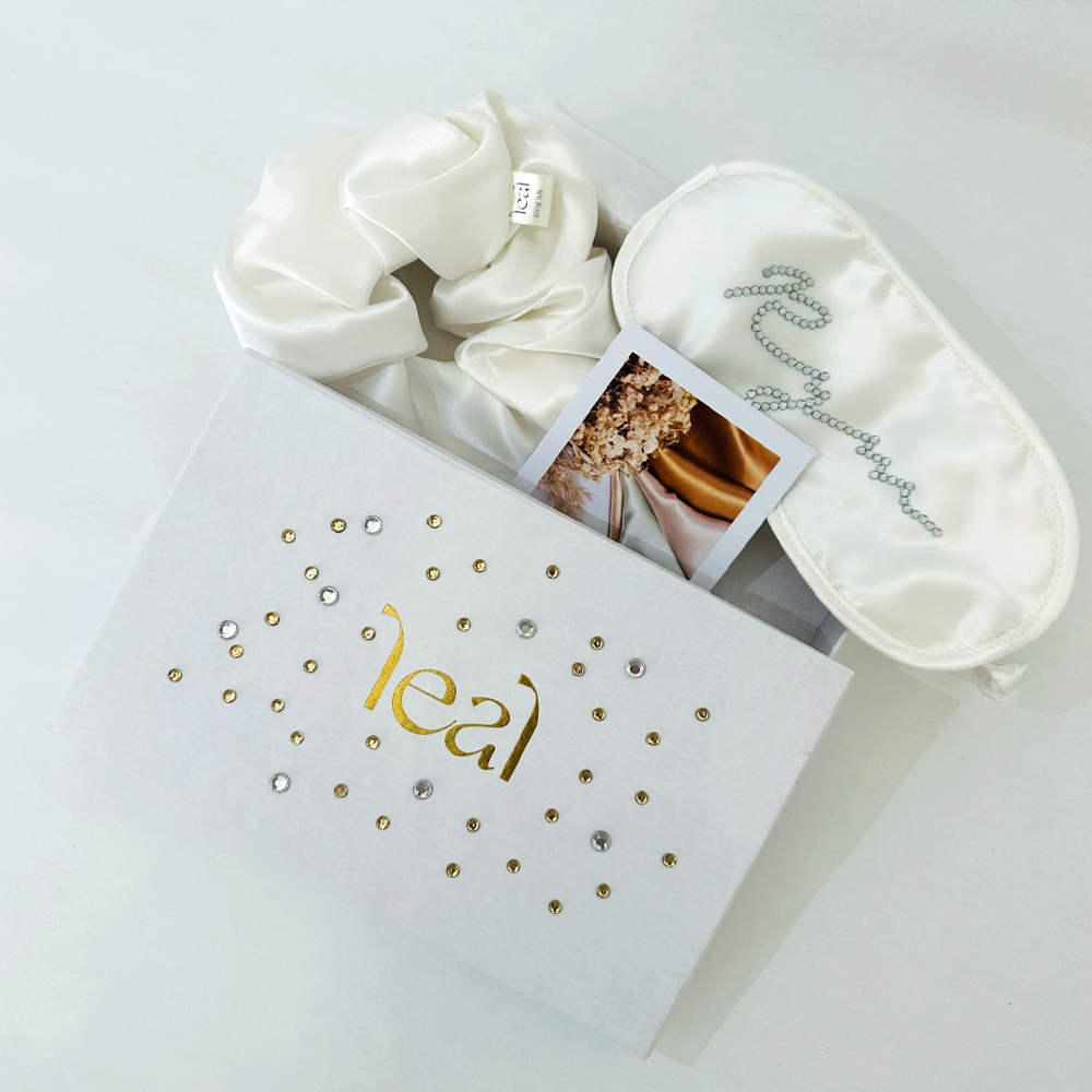 Le masque de sommeil en soie leal personnalisé avec strass est l’accessoire parfait pour chaque mariée. En plus de ses bienfaits pour le sommeil et pour la peau, il ajoute une touche de luxe à votre trousseau.